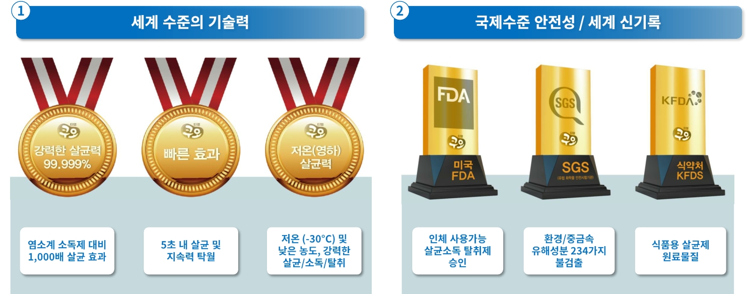 살균작용을 하는 산소계성분을 사용하면서도, 대한민국 최상급 정화수인 '코아수'를 사용하여 병원에서 내시경 소독에도 사용하는 성분과,