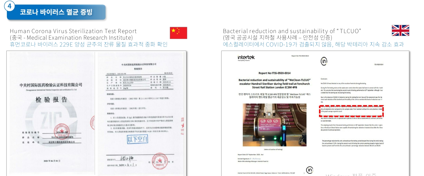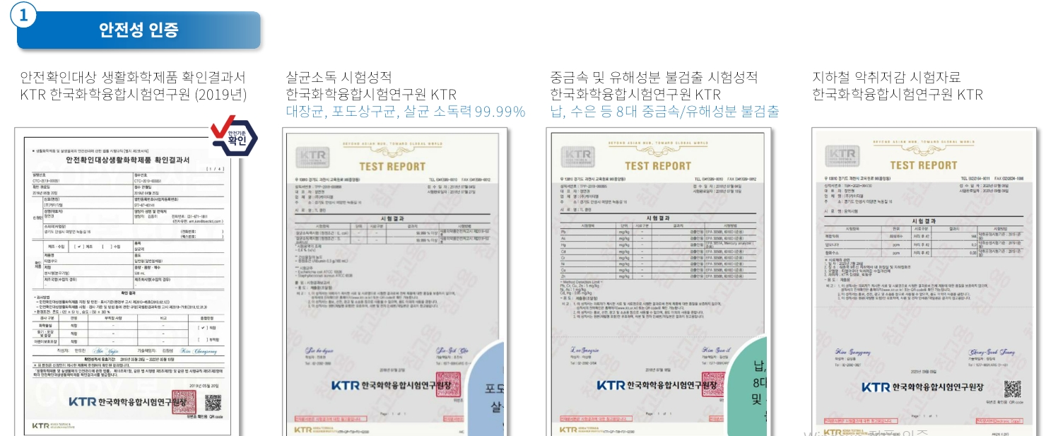가장 안전하고 믿을수 있는 '공기중 부유 세균 저감실험'을 한국산업안전기술원 등의 성적을 획득했습니다.